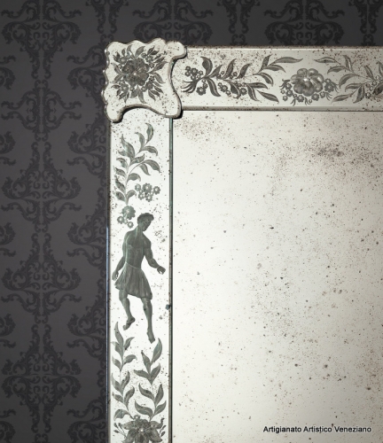 Specchio antichizzato e minuziosamente molato ed inciso a mano con ruota in pietra arenaria.